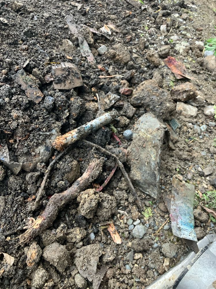 謎の金属板や水道管の破片、瓦、ガラス、ゴミ類がたくさん出てきて大変だった。