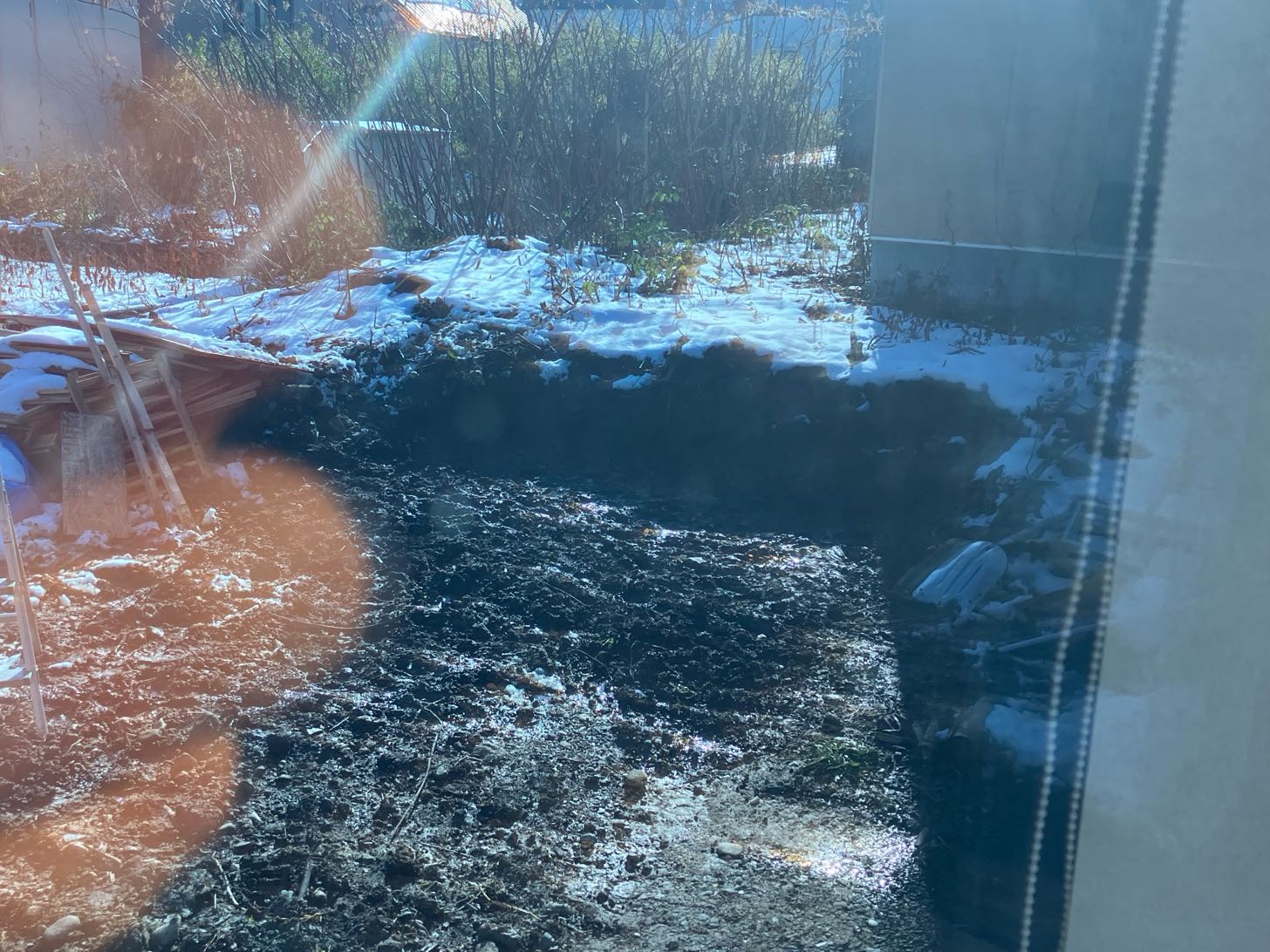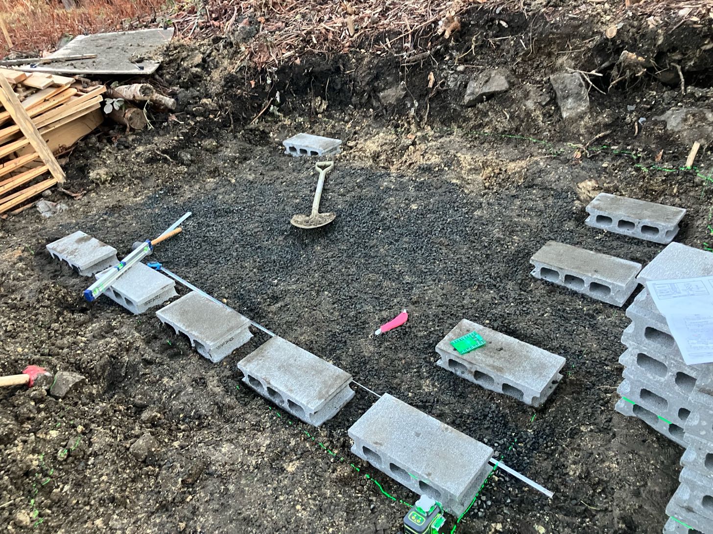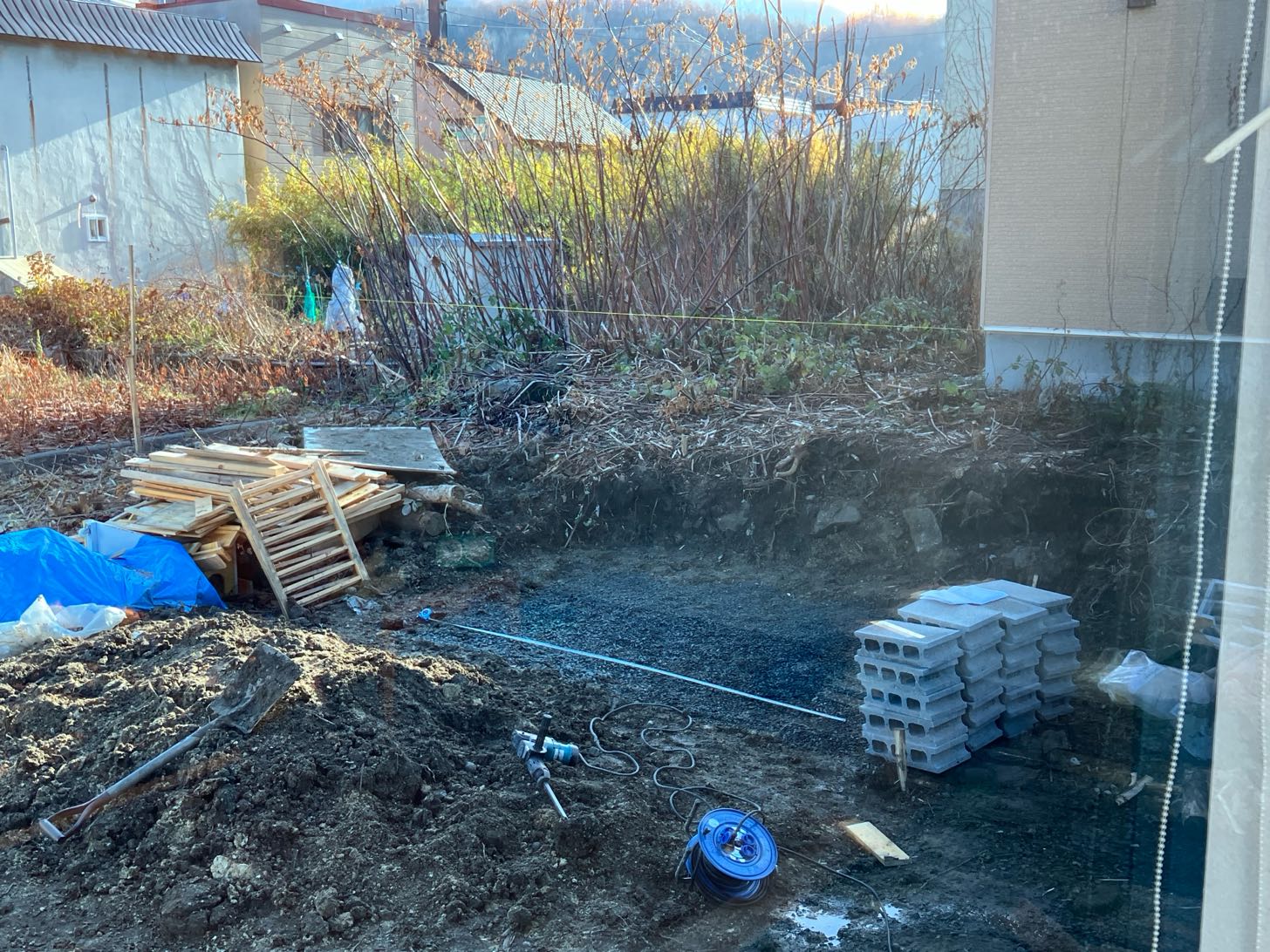 雨が降るとねるねるねるねみたいになるので、好天が数日続いて乾いたら買ってきた砂利を敷いて、ブロックで基礎を作る予定。