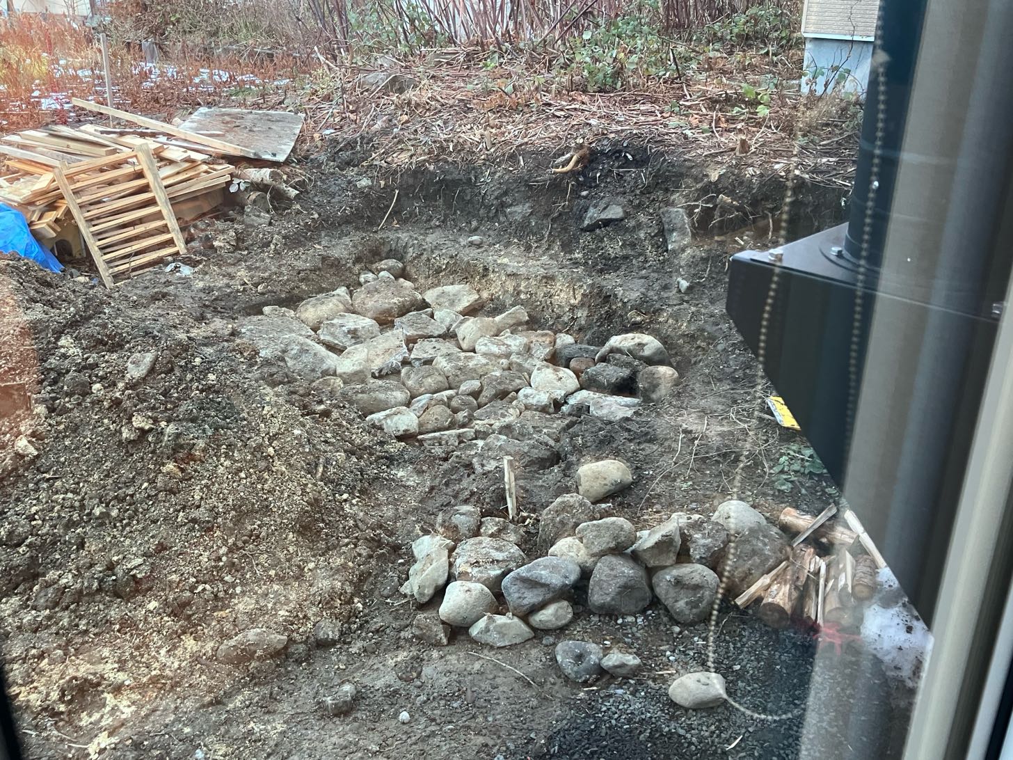 話が逸れたが、掘った穴に根切りした時にゴロゴロ出てきた石を詰めた。