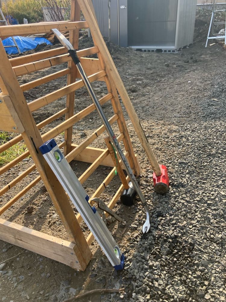 これから屋外物置を組み立てるために基礎を並行にしなければいけないんだけど、これが相当難易度が高い。